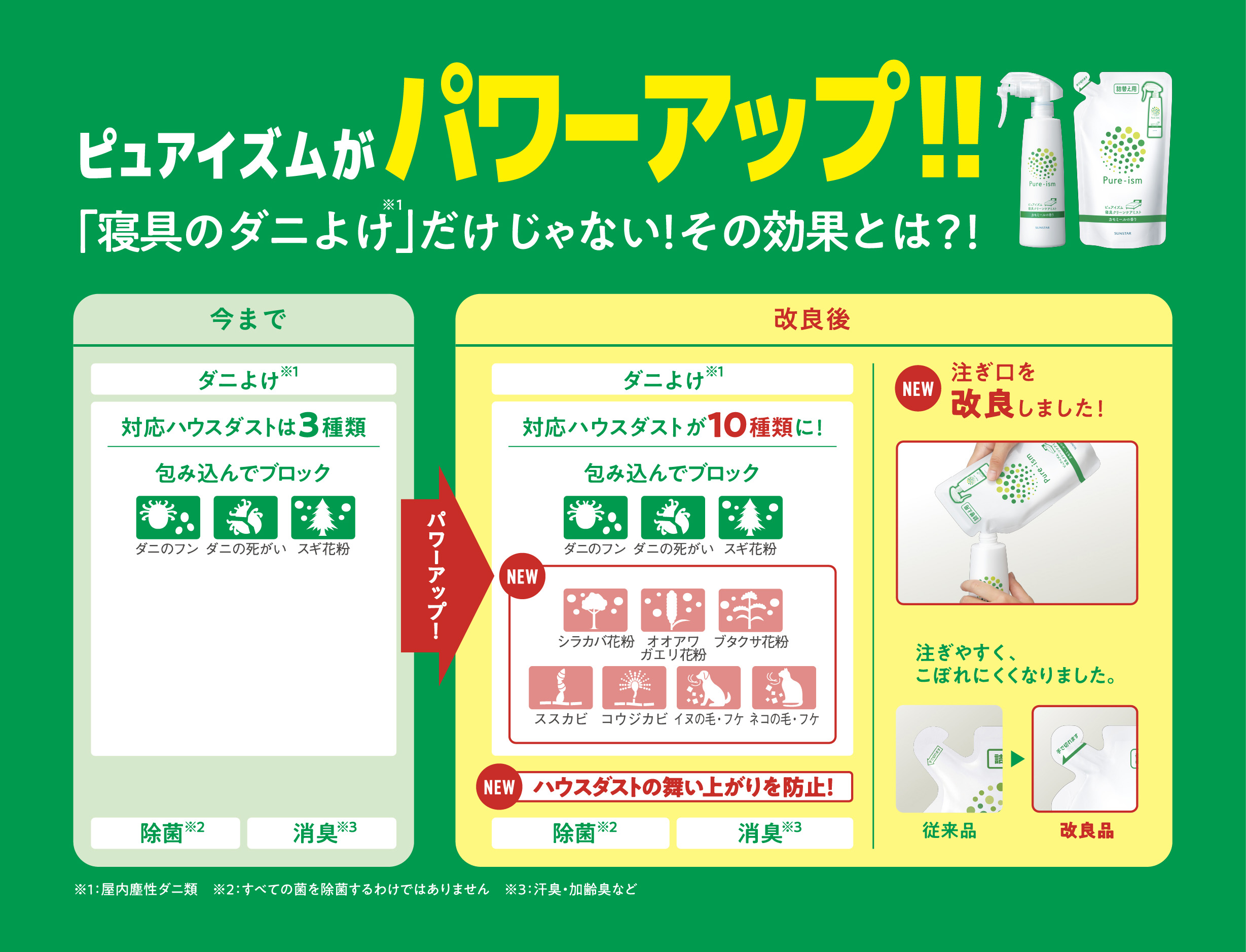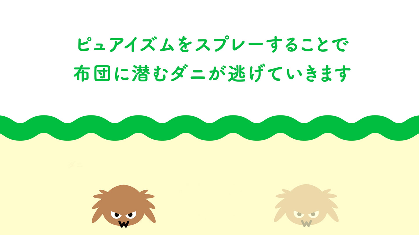「ピュアイズム 寝具クリーンケアミスト」は、除菌・消臭にプラスして、寝具のお手入れで多くの方が気にしているダニよけ効果があります。またダニのフンや死がい、花粉、カビ、犬の毛・フケ、猫の毛・フケなどを包み込んでブロックするという働きがあります。さらにこれらのハウスダストの舞い上がりを防止する効果もあります。